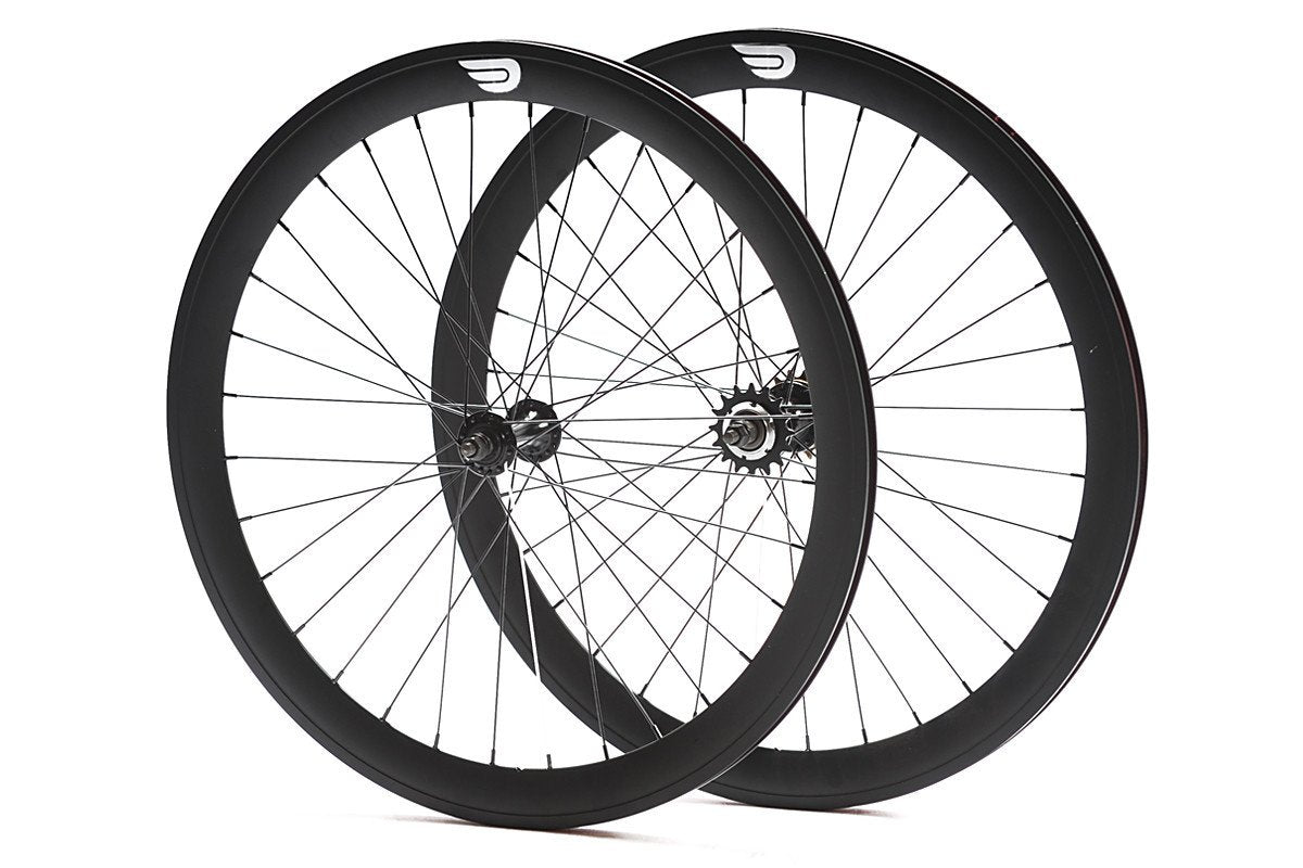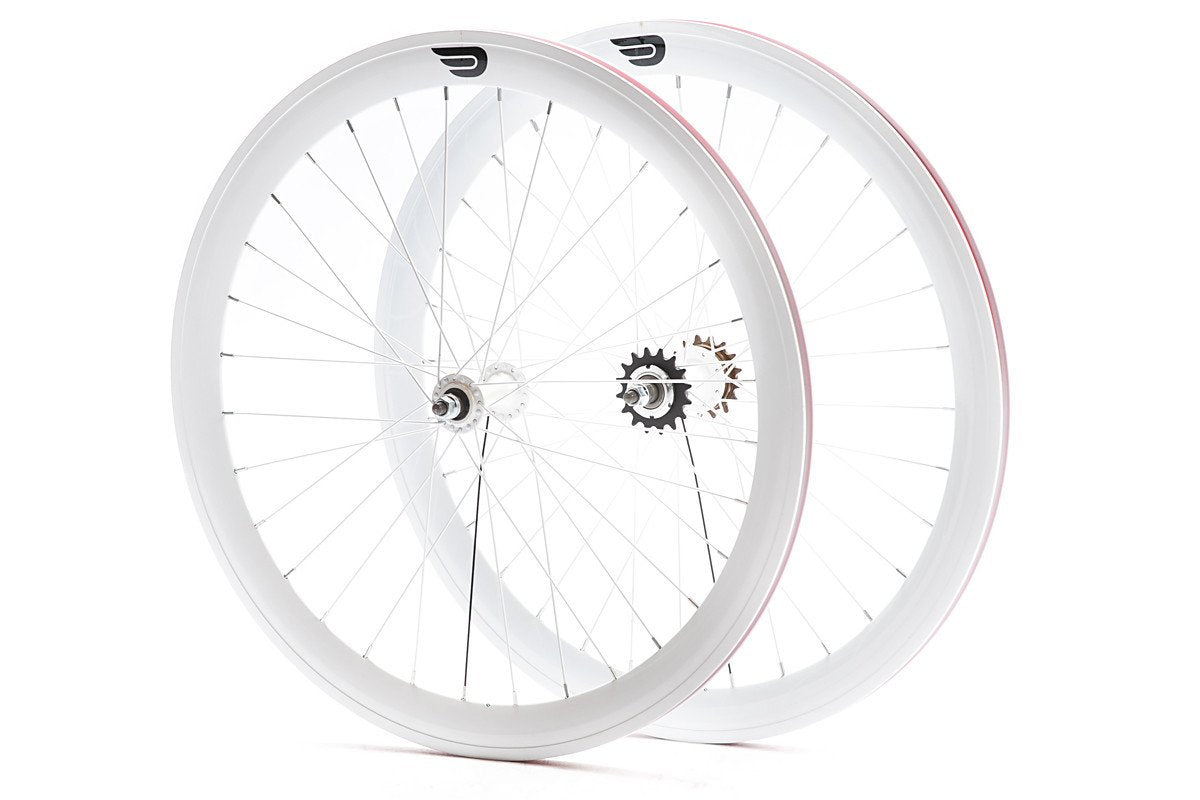 Designed for speed and style in a more compact package, these Pure Fix double-walled aluminum wheelsets are size 650C with a 45mm rim depth, front and rear. Our wheels include name-brand and laser-etched, 120 mm KT Quando hubs. Our rear wheels include flip-flop hubs with a pre-attached 16T fixed cog along with a 16T freewheel cog for single-speed riding. Front and rear wheels feature 32 spokes each and all wheelsets include nylon rim-strips to protect against sharp edges and prevent tube puncture.